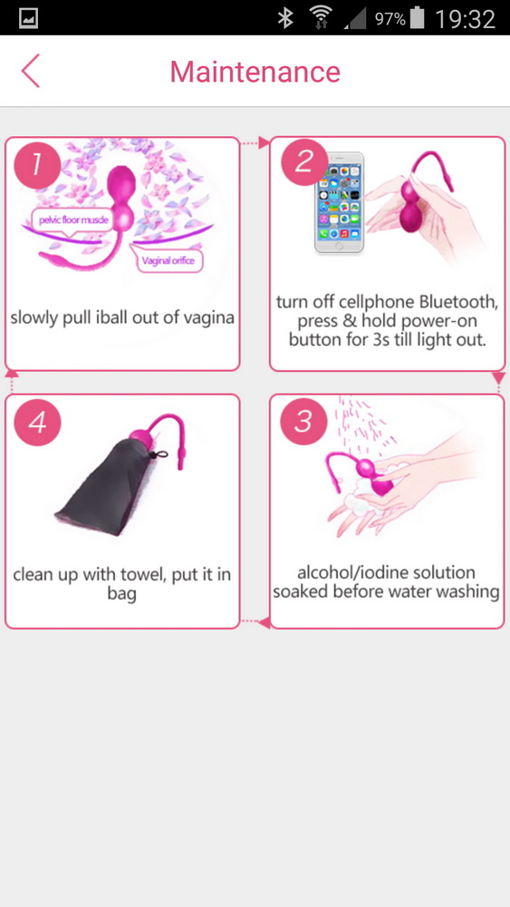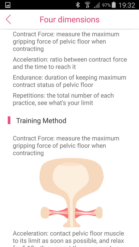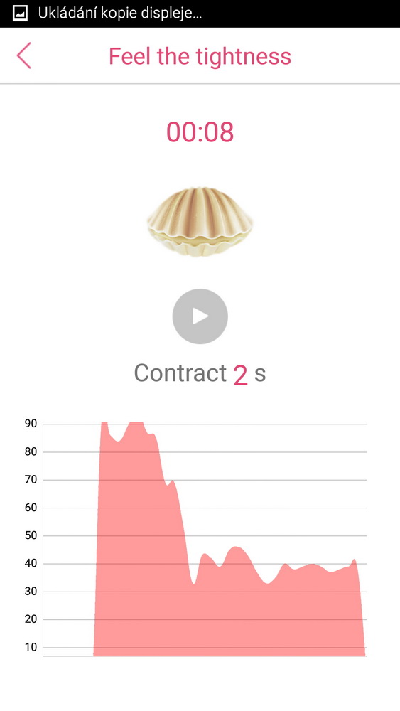Zaujmete pohodlnou – mírně gynekologickou polohu a cvičíte podle instrukcí = pár sekund stah, pár sekund uvolnění. Aby nebylo nutné stále sledovat displej, tak jednotlivé cviky jsou avizovány krátkým zavibrováním. To celé se opakuje po nastavenou dobu.