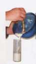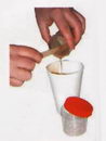 Zapněte si stopky v okamžiku, kdy vlejete 425ml vody ohřáté přesně na 37oC do mísící misky. Vsypte obsah do misky rychle a začněte míchat. Na důkladné promíchání máte strašně krátkou dobu – pár vteřin! Jakmile bude obsah dokonale promíchaný a mírně ztuhlý (do 30 vteřin), vylejte celou misku do připraveného zkráceného válce (ne později než po zmíněných 30 vteřinách). Pomocí stěrky, krční špachtle nebo lžíce, vyčistěte misku, naplňte válec a zasuňte do něj penis v plné erekci. Před koncem tohoto limitu (2 minuty) musí být penis plně zasunutý až do maximální hloubky. Snažte se jej udržet mimo stěny válce – aby se penis stěn příliš nedotýkal.