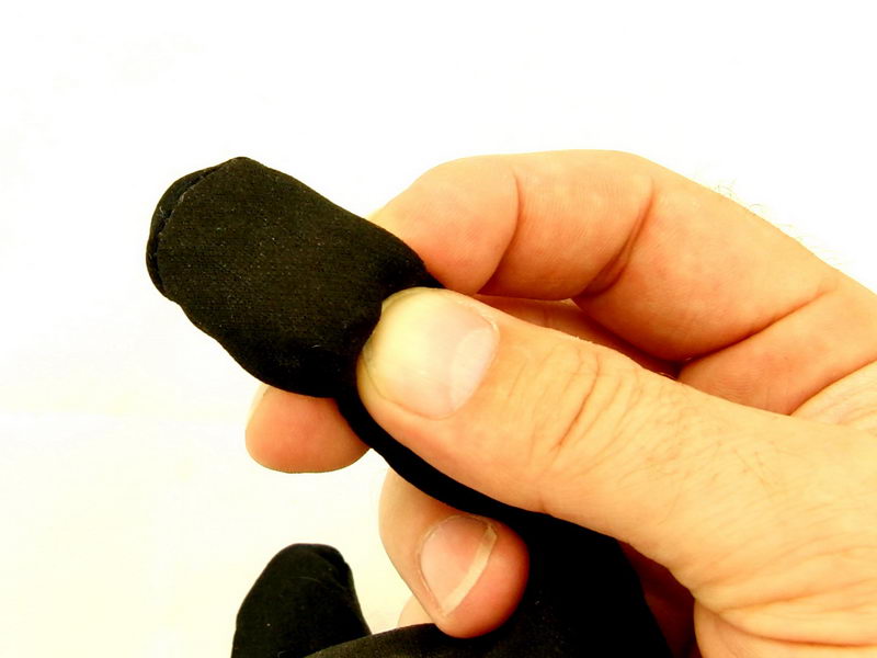 Napohled je to normální rukavice z nylonu (nebo silonu nebo kýho šlaka). Prostě něco jako na kolo. Pružné, příjemné a i když mám medvědí tlapu, tak jsem je natáhnul (no… – jentaktak). Na zápěstí je utahovací řemínek, který mě spíš rozčiloval, ale u malé ručky je asi nutný. Pod každým prstem je malinký polštářek obsahující vibrátorek. Od palce až po malec.