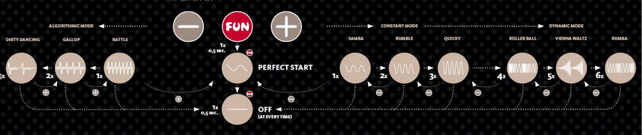 Stiskem (FUN) se spustí základní program a tady je další zajímavost. Tento typ úvodního programu je někde uprostřed a přepínání na obě strany vede k rozdílným efektům. Stiskem (-) je možno navolit 3 zpomalující programy, které jsou velmi relaxační a jemné. Poslední se již chová jen jako když má muž poorgastické jemné cukání (“přímrdy”). Jeden prudký náraz vnitřního závaží přibližně za sekundu. Od středu nahoru = mačkáním tlačítka (+) se volí 3 intenzity přírazů.