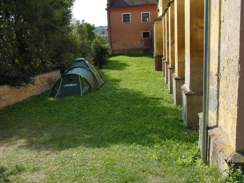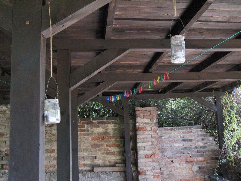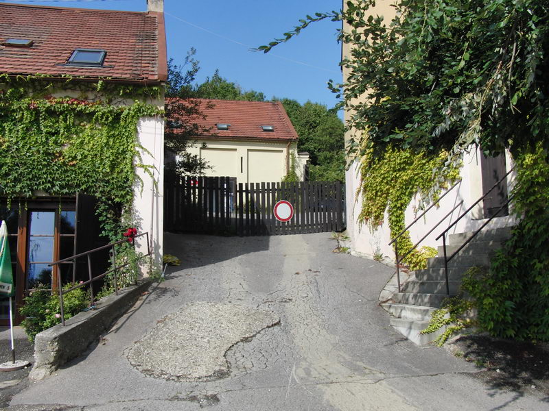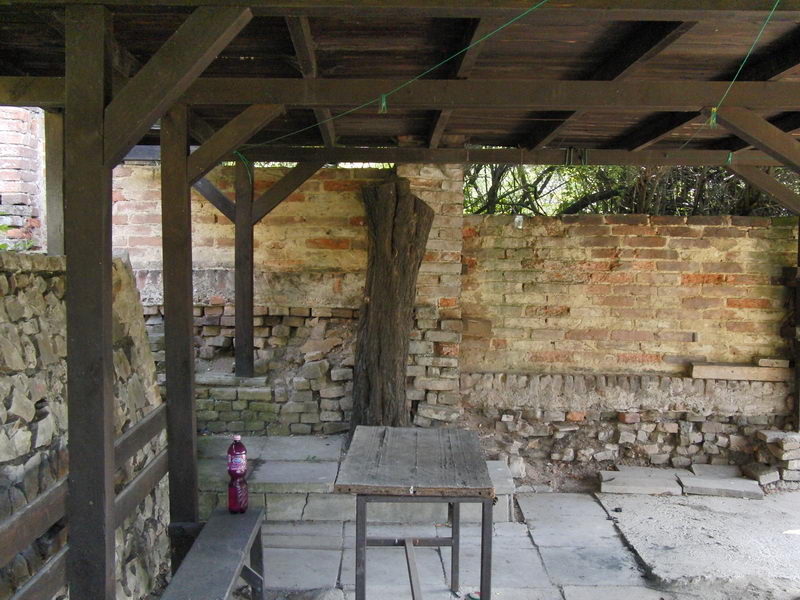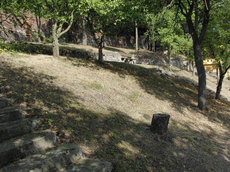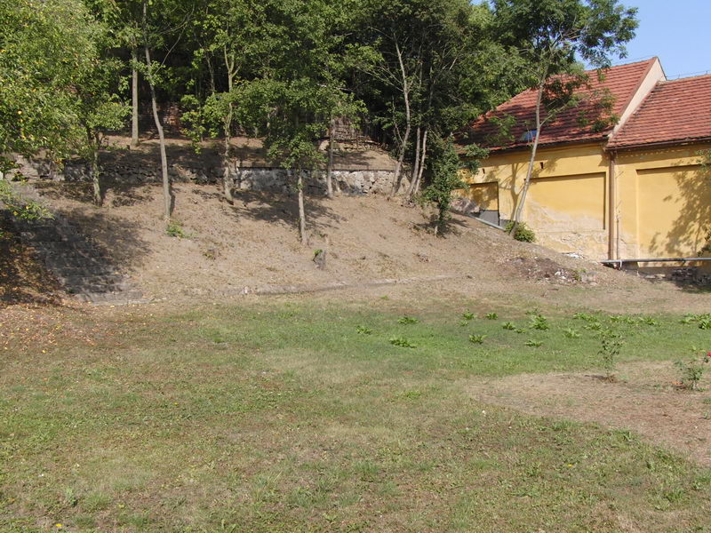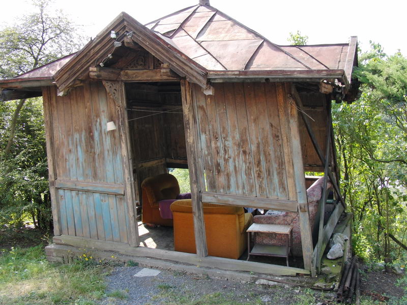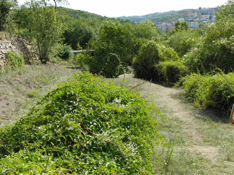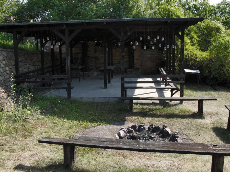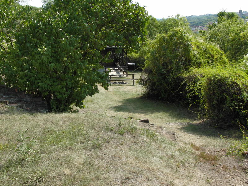 A jdeme na druhou stranu – pro změnu dolů. Cestou je sice polorozpadlý, ale zase roztomilý altán a vzniká velká snaha jej opravit a uvést do provzovatelného stavu. Sedací soupravy slibují velké pohodlí i zajímavé zákoutí. Terasovitý sestup je krásnými zahradami – jen je třeba dbát pozor na vysokou stěnu, která spadá vpravo do rokle a nad zahrady neční příliš vysoko. Po cca 100 metrech je další altán s ohništěm, který bude mít speciální a velmi vítané určení