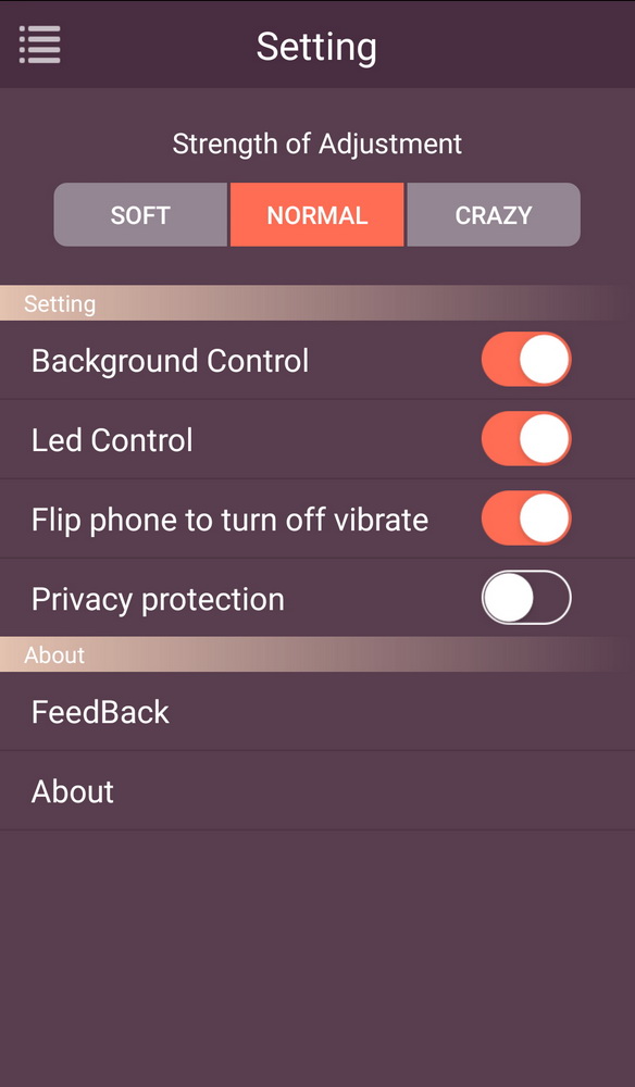 Upřímně řečeno jsem moc nepochopil význam téhle funkce. Dá se ovládat že apka běží “na pozadí”, jestli bliká LEDka, vypnout vibrace pohybem mobilu, zaheslovat to – a to všechno v různých módech intenzity. Chvíli jsem si s tím hrál, ale mám pocit, že to málokdo využije.