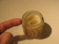 u a tak jsem vyndal ten zázrak… Skleněná dóza s plastovým víčkem už tolik nenahrává fantazii designu, ale nejsme na výstavě flakónků! Otevírám a ….. prostě svíčka. A pak se najednou zjeví aura vůně a já si říkám : „Teda hochu, jak tohle popíšeš – na to jsem fakt zvědavej…“. Mě osobně to voní krásně. Stačí zavřít oči, přivonět a už to mám – tak nějak trochu skvělé jojoby, nějaké avokádo, kapička sezamu, mihne se i grepová tresť, určitě mandle, lehounce olivový olej, trochu víc palmového a každopádně mangové máslo. ….. Jo a v návodu ještě píšou vitamín E…. Ale to jsem asi neměl prozrazovat. No prostě patlámymatlámy všeho možného a nakonec to fakt hezky voní. Sáhnul jsem dovnitř a chová se to trochu jako hodně ztuhlé sádlo z mrazáku = taje to pod prstem, ale v běžné pokojové teplotě to drží pevnou konzistenci.