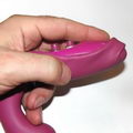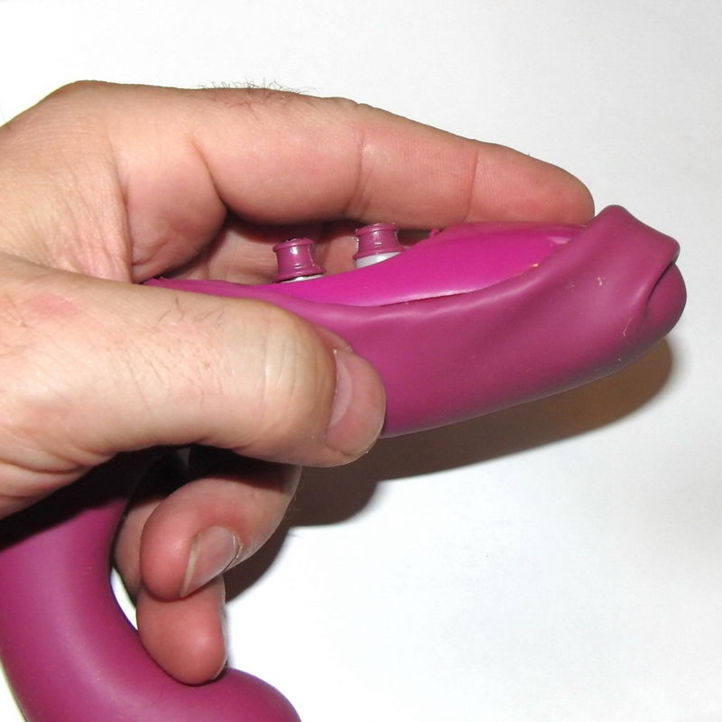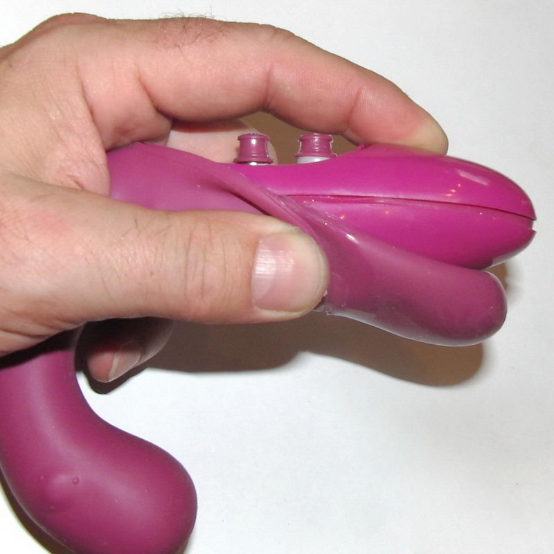 Abych se dostal ke šroubkům, bylo jasné, že musím demontovat ještě nějaký díl a tak jsem zle zariskoval a zatáhl za silikonový obal. Myslím, že byl těsně na hranici prasknutí, když se mi podařilo jej přesmyknout přes konec vibrátoru. Jakmile jsem jej stáhnul, vypadnul celý ovládací i vibrační díl. A první překvapení bylo na světě – G-Ki nemá dva motory!!!!! Ale má velmi zajímavý systém převádění vibrací od motoru pomocí tvrdých silikonových pouzder, která zapadnou do zbytku těla a vibrace převedou až do přední (menší) hlavy.