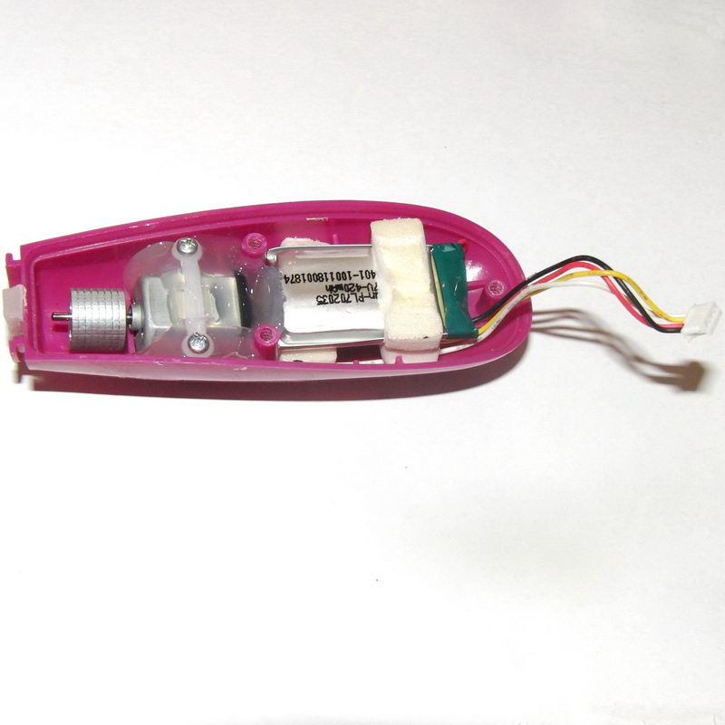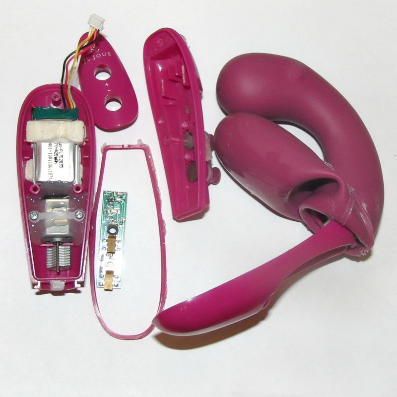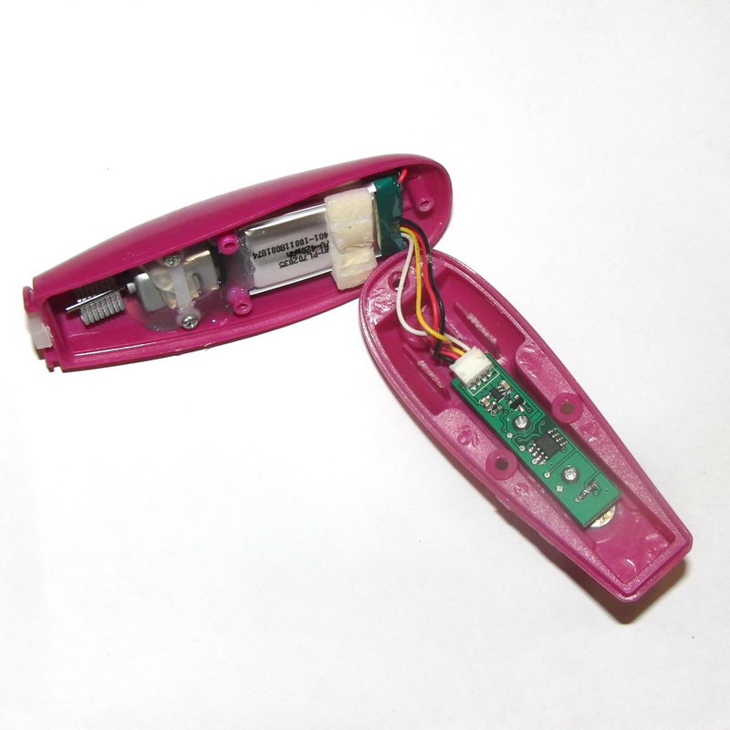 Povolil jsem šroubky a otevřel srdce celého vibrátoru. Těsnění nebylo lepené, ale má zvláštní profil a je třeba jej odložit tak, jak je vyndáno a stejně jej pak vracet. Malý tištěný spoj s elektronikou, propojovací kabel na konektor, akumulátor a motor s excentrem uložený do skvělé lité hmoty připomínající těsnící silikon, ale podstatně tvrdší.