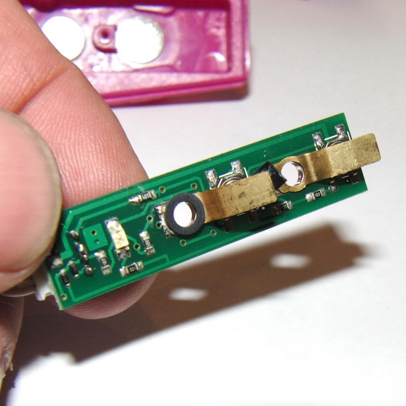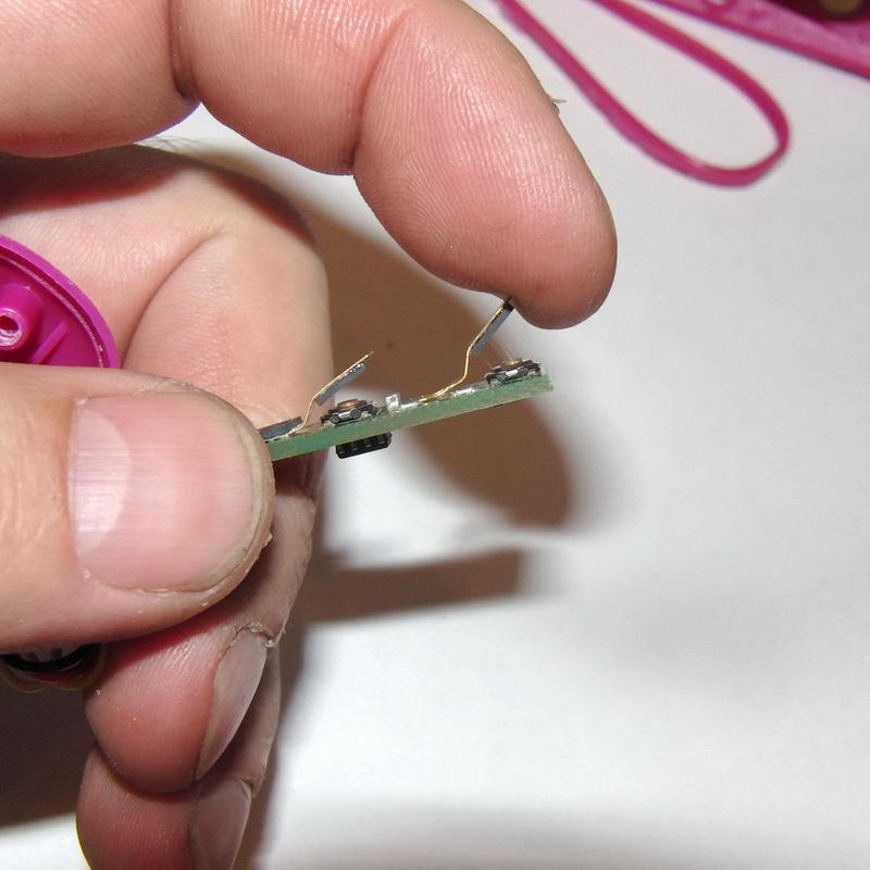Vyjmul jsem plošný spoj a závada byla okamžitě identifikována. Pružné kontakty mají vespodu nalepenou pryžovou podložku, která dosedá na mikrospínač. Na spouštěcím kontaktu se ale gumička odlepila a posunula. Tím se muselo tlačítko mačkat až o 0,5mm hlouběji, ale to už zase nedovolovala hrana plastu. proto to nešlo zapnout.