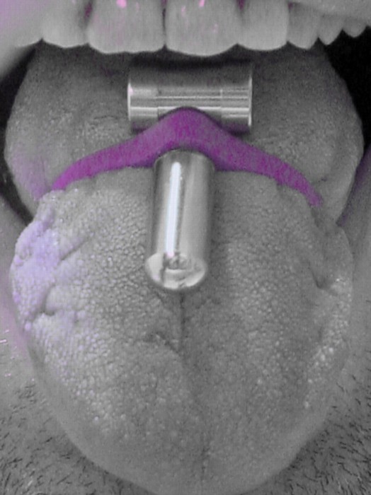 Pochopitelně jsem potajomky šel zařízení vybalit a vyzkoušet do jiné místnosti. V návodu bylo uvedeno, že se má vybrat vhodná velikost gumičky pro jazyk, ale jiná než ta střední nebyla možná. Navlékl jsem vibrátor do gumičky a s velkými obavami gumičku navlékl na jazyk. Bylo zvláštní, že očekávaný dávicí efekt se vůbec nedostavil a také jsem očekával, že to bude lochtat na jazyku, ale nic z