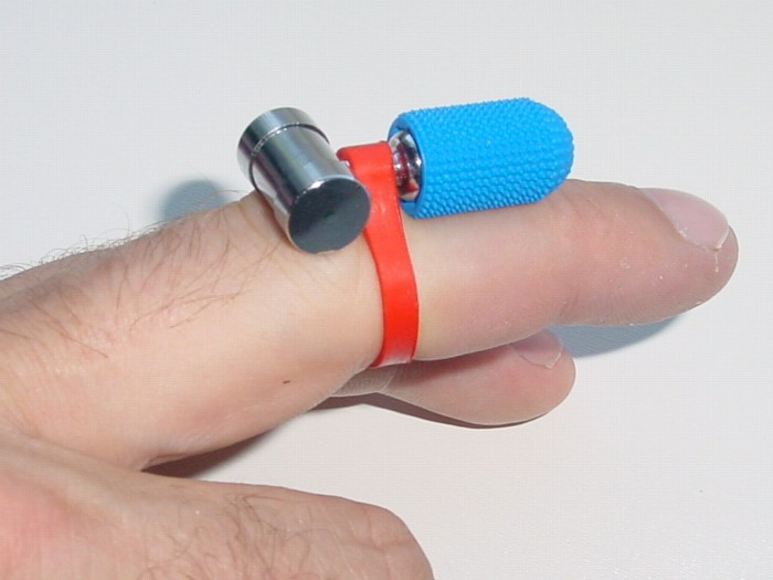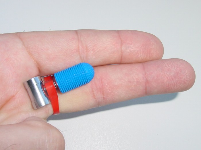 V odpočinkové fázi jsme trochu začali studovat další obsah balení a začali experimentovat. Malá gumička perfektně seděla na prstě… Vibrátorek tedy putoval na horní hranu ukazováku – asi tak na první kloub a naslintané bříško zase na tu kuličku štěstí. Ale vzápětí mi to sebrala a