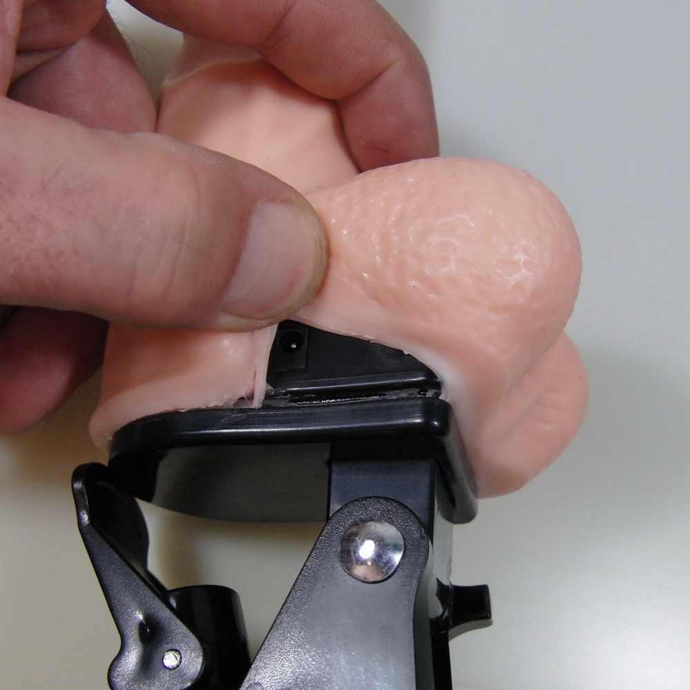 Počáteční nadšení jsem nyní opustil. Dvě hodiny jsem hledal jakoukoliv dírku, kam ho strčit – ten konektor od kabelu. Na druhém varleti sice byla “jakási” značka, ale nebyl v ní ani mikroskopický otvor. Takže nezbylo nic jiného, než to začít na boku párat a hledat uvnitř. Jak jsem to začal kuchat, tak mi bylo jasný, že předpokládaná vodotěsnost není úplně jasná. Některá místa na přilepené hraně opravdu držela, ale jinde to nebylo přilepené vůbec. Takže tudy by se voda dovnitř lehce dostala. Takže představy řádění v plné vaně, kam by si ho mohly dámy přicucnout jako zarážku proti utopení při usnutí – asi ne… Zdířku jsem našel opravdu naproti hlavnímu tlačítku a opravdu tam nebyla žádná perforace. Takže jsem to poprvé nabil ohrnuté a pak jsem vyrobil pidi-dírku a dál už nabíjel tak, jak si to asi výrobce představoval. Umělé vagíny se dost často vyrábějí s panenskou blánou, ale u nabíjení mi to připadá jako přehnané 🙂