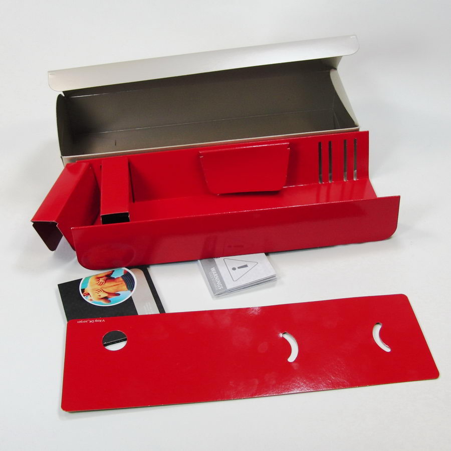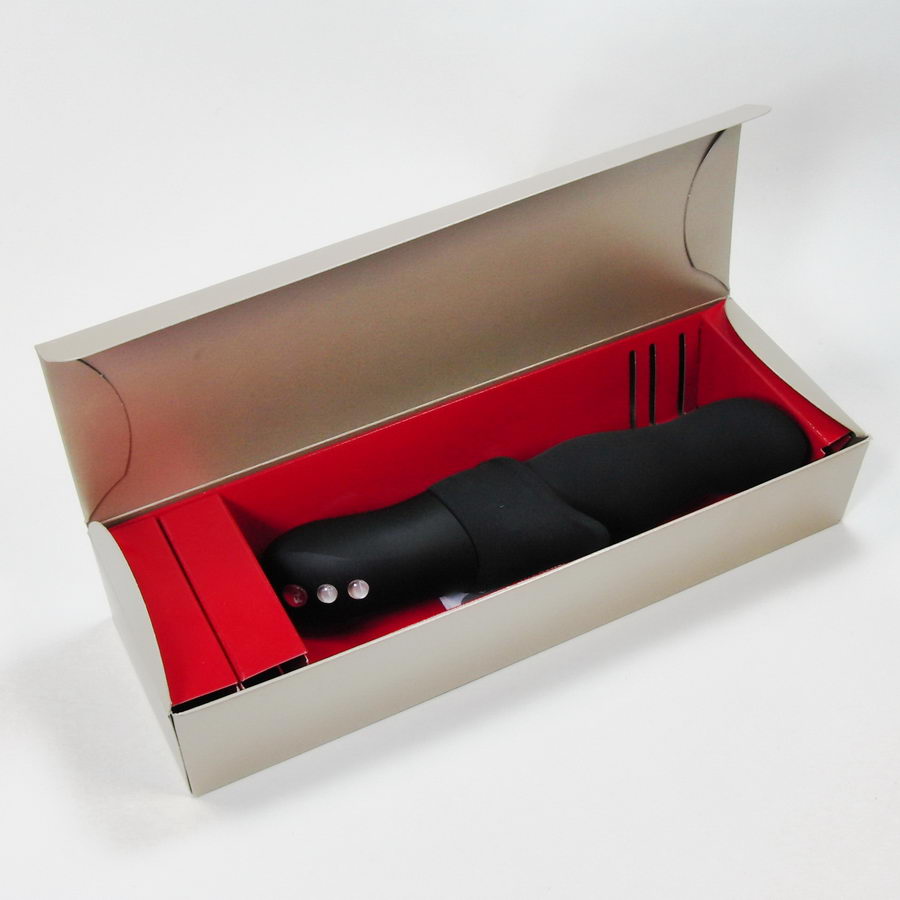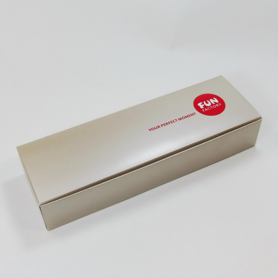 Fun factory si drží prim i v nápadech na obaly. Dlouho držela na vrcholu takovými podivnými krabičkami, které byly atraktivní, ale pokud jste zboží vybalili, už se to nikdy nedalo poskládat zpět jako originál. Nyní nastoupila skupina úsporných řešení = mají jen pár modulů velikosti, které se uvnitř vyplňují zarážkami pro aktuální velikost produktu. Mění se pouze přebal a návody uvnitř. Papírové krabičky mají skutečně příjemnou barvu – takovou lehce růžovo-zlato.světlehnědou matnou perleť s rudým vnitřkem. Produkty mají nylonovou síťku na ochranu PC.ABS plastové rukojeťi proti otírání o vnitřní papírové stěny.