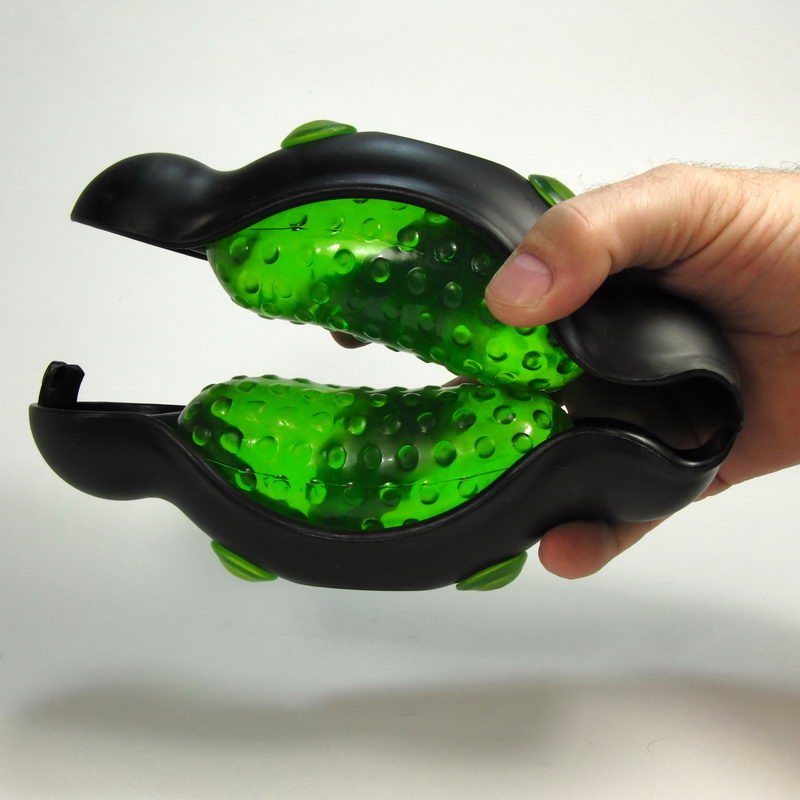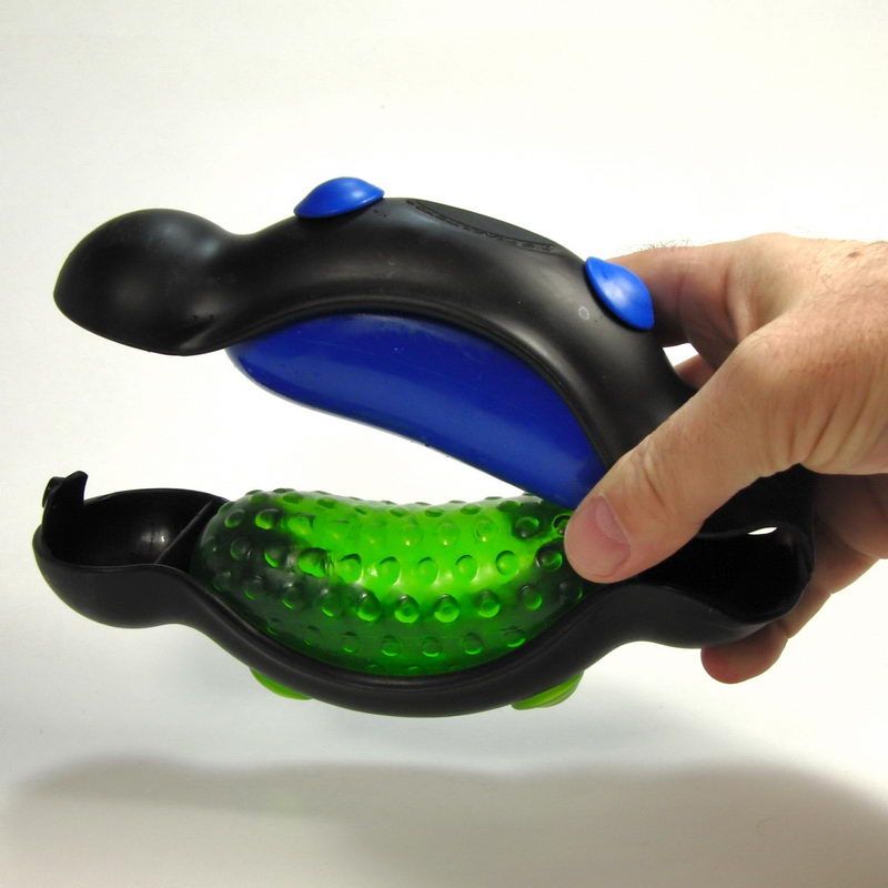 Je to strašně veliký! Když jsem viděl první fotky, myslel jsem si, že je to podstatně menší. Další překvapení bylo v tom, že ty měkké vložky uvnitř jsou z nějakého sice tajného, ale bezpečného materiálu a uvnitř je tekutý gel. Takže na omak je to podobné silikonovým implantátům, ale silikon to není. Jen síla stěny bude asi silnější. Černý obvodový obal je jen takový plastový klepeto s ohýbacím pantem – který bych moc často a moc drasticky neohýbal. Zacvakávací uzávěr taky nevyzařuje přílišnou důvěru. A navíc je to celé docela těžké. Taky jste tak zvědaví jako já?