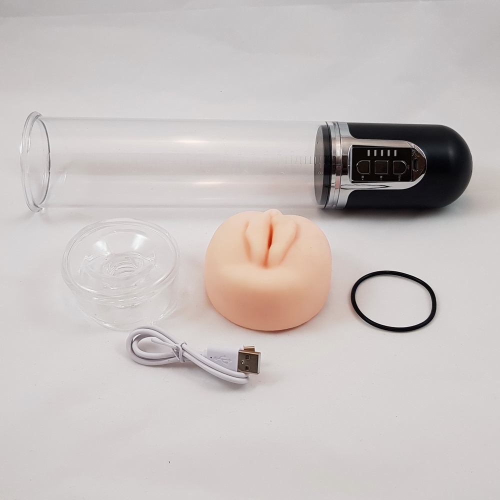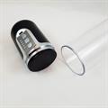 Pumpa je bohatě dimenzována i na velký penis, a pokud se někomu dovnitř nevejde, tak buď kecá, nebo by měl upalovat do porna. Na akrylátovém válci je měřítko, které podporuje “rekordování”. Když vás číslo na měřítku vyděsí, tak si válec otočte o 180°, protože čučíte na americké palce. Z druhé strany jsou centimetry :-). Vývěva rozhodně není voděodolná a už vůbec není vodotěsná. Proto výrobce vymyslel geniální oddělování pumpy od válce = prostě válcem lehce otáčíte a pumpu stáhnete. Válec pak můžete pohodlně a důkladně umýt. Na přírubě pumpy je velký těsnící okroužek. Ten si chraňte proti poškození, a pokud k tomu dojde, výrobce přidává do balení jeden náhradní. Aby se jeho plochy rozebíráním neodřely, asi bych doporučil lehké máznutí silikonovým lubrikantem. Nebude to sice pak držet pohromadě tak pevně, jako když je to suché, ale okroužek vydrží déle a bude to lépe těsnit. Otáčení válce a pumpy vzájemně je fajnové také proto, že si nastavíte svoje jednotky na stranu tlačítek. Vakuová pumpa Boom Maxman plus – Rozměry