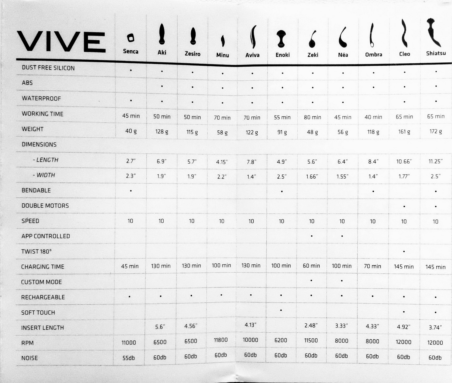 Jejich níntenzita je přibližně střední, i když u větších modelů je hlubší a intenzivnější. Menší jsou vzhledem k rozměrům odkázány na malé vibrační jednotky, takže vibrace se mění na takové to jemné bzunění. Pro spoustu žen je to zajímavější tím, že to netáhne tak brutálně k orgasmu a masturbace je pak delší a jemnější. Výrobce uvádí hlučnost jako max 60dB – u všech modelů, ale myslím si, že to je nepřesné, protože při testech byla hlučnost různá. Každopádně ale Vive nepatří mezi extratiché. Spíš se pohybují tak nějak ve středu erotických pomůcek. Na tak dokonalý design a vůbec poměrně vysokou úroveň všech produktů, by to mohli trochu ztišit.