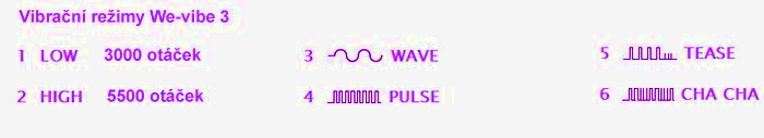 Již jsou na trhu pomůcky, které mají i 10 vibračních programů – ale zamyslíme-li se, pak je jasné, že stejně budeme používat jeden – max. dva a ostatní vždycky přecvakáme. Takže We-Vibe zvolilo nejrozumnější variantu = dvě základní rychlosti. Ty určitě postačí a dále 4 nejoblíbenější vibrační programy. To je velmi zdařilé řešení, protože se neztratíte a nebudete marně hledat ten nejlepší.