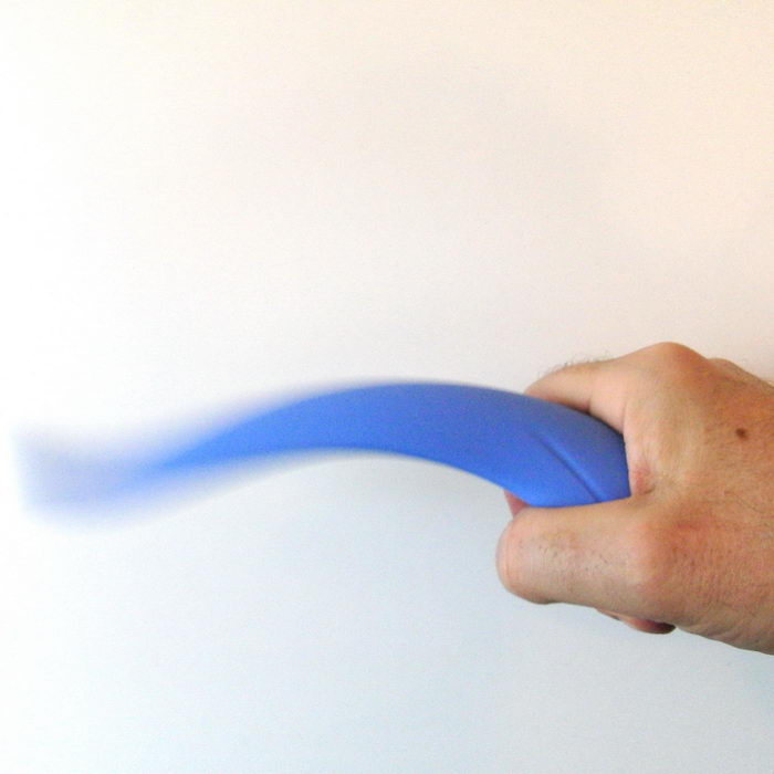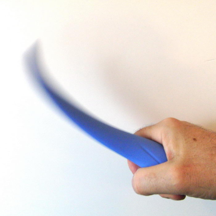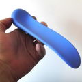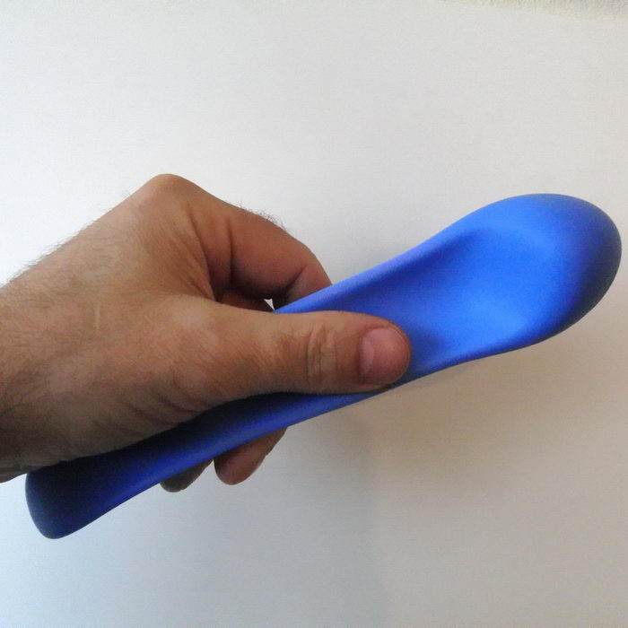 Ten rozdílný efekt vytváří různý tlak vzduchu, který se vytváří při dopadu. Testinka miluje širší předměty a tak jsem otočil Sklouzka tak, aby dopadly dvě boční hrany jako první a tlak zůstal uvnitř. Pleskanec jako blázen. A další a další a na stehna, lýtka, pak střídavě obě strany Sklouzka na chodidla i na dlaně… Nakonec velmi jemně na prsíčka – jen měkkým jazýčkem na konci.