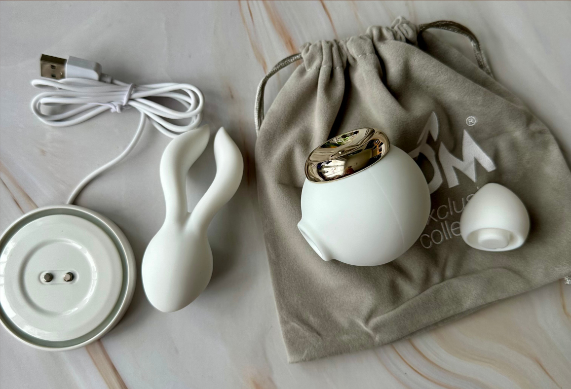Celá hračka je potažena bílým lékařským silikonem, který je na dotek velmi příjemný. Dobíjecí stojánek s magnetem je vyroben z kvalitního ABS plastu. Kombinace čistě bílého těla a lesklého pozlaceného kroužku pod hlavou králíčka působí velmi elegantně. Příjemně nás překvapilo i balení – magnetická krabička je designově dotažená a působí luxusně. Osobně oceňuji i samotné balení, protože tyto hračky často dávám jako dárky – a hezký obal ušetří práci se zdobením.