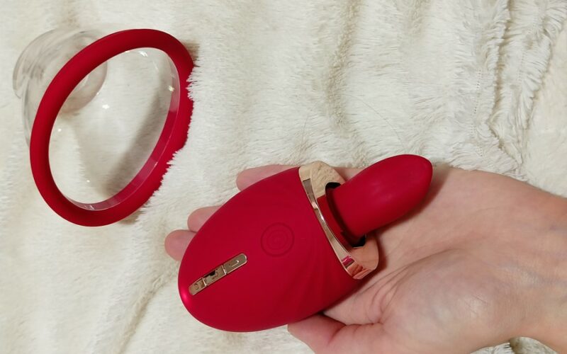 Jazýček je pevnější, než jsem předpokládala, ale je obalený jemným silikonem, takže je na dotek velmi příjemný. Stejně tak i rukojeť pumpy je potažena jemným silikonem. Dále je ze silikonu i odnímatelný okraj u zvonu. Díky tomu jde vše krásně a jednoduše omýt a připravit na další zábavu. Samozřejmě čistíme buď dezinfekcí, nebo stačí teplá voda s mýdlem. Co se týká lubrikačního gelu, tak ten zvolíme na vodní bázi, nebo speciální silikonový lubrikant. Klasický silikonový gel nemáme dávat, jak jsem byla poučena, z důvodu zničení silikonových povrchů – poleptání. Co se hlučnosti týká, pokud bych měla hodnotit jako známkou ve škole, dala bych 2-. Není zrovna ultra tichým zařízením, ale já osobně to nevnímám ani jako nic extra hlučného. Vzhledem k tomu, že pumpa dokáže vytvářet podtlak docela silný (6 různých variant podtlaku), očekávala bych klidně i hlučnější hračku. Navíc je zde i jazýček, který nabízí 9 variant kmitání… No ale o kmitání a jazýčku už více v samotném testování…