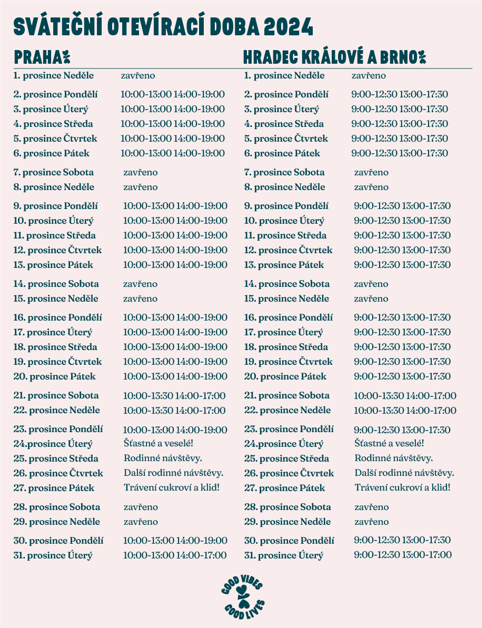 Patříte spíš k těm, kdo rádi využijí doporučení zkušených prodavaček ochotných poradit? Stovky produktů si můžete přijít prohlédnout osobně. Zde je přehled otevírací doby během svátků 2024.